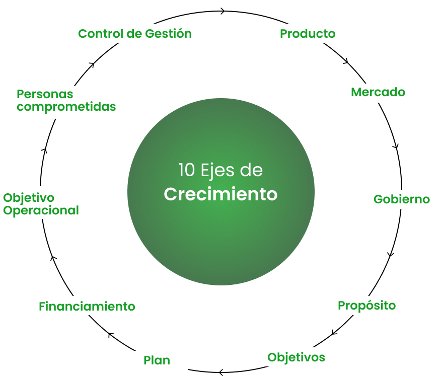 Con años experiencia en compañías de rápido crecimiento, desarrollamos la metodología 10 Ejes de Crecimiento, que adapta herramientas de grandes empresas a medianas. 10 ejes conectados entre sí, como una cadena tan fuerte eslabón más débil (el que puede destruir tu compañía, o hacer tu crecimiento más lento). Un diagnóstico profundo nos permite detectar debilidades y construir un plan de acción enfocado en los desafíos más urgentes.